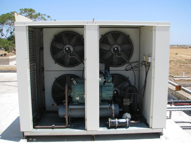 Une nouvelle armoire électrique a été installée, intégrant le circuit de puissance et de télécommande pour le groupe MEGA. Le système est équipé d’un compresseur BITZER type 6G-40.2 avec couplage étoile/étoile PWS et fonctionnement PUMP DOWN, garantissant performance et sécurité.